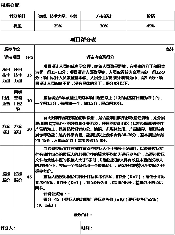 十三、本招标项目以评分权重分配原则进行评标,评分项目含有资质、技术力量、业绩,占比25%;方案设计,占比30%;投标价格,占比45%。以综合得分高者中标。项目评分表详见附件。