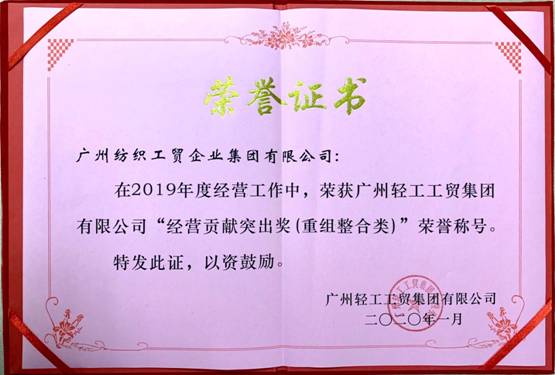 2019年,在广州轻工集团的大力支持下,在纺织工贸集团新班子的正确带领下,集团转型升级步伐大大加快,整体局面的掌控能力得到大大加强,逐渐形成“纺织全产业链专业化和城市资产创新发展”双轮驱动的新战略,集团经营质量不断提升,新技术、新手段、新形式得到广泛应用。纺织人用汗水和实干取得了可喜的成绩,荣获广州轻工集团“经营贡献突出奖”和“科技进步奖”荣誉称号。