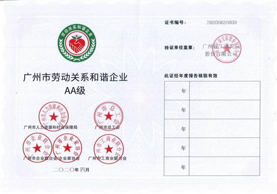 市劳动关系三方协商会议复审,2020年4月,广州轻工研究院股份有限公司荣获“广州市劳动关系和谐企业AA级”称号。