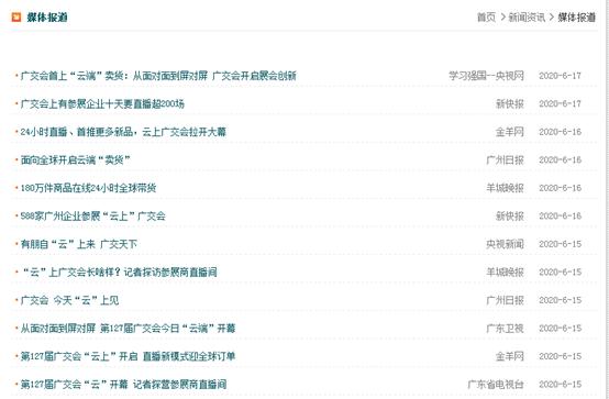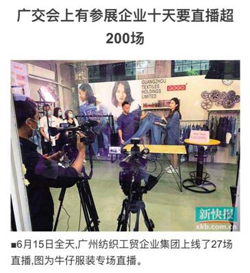 自6月15日第127届云上广交会开幕以来,纺织公司凭借3D建模、VR等数字化技术,把产品与展厅全面搬上云端,3大场地、9个专业直播间,每天不少于27场直播,24小时轮动直播,在加上外贸业务人员娴熟专业的优秀表现,吸引了大批新闻媒体的广泛报道。据不完全统计,截止6月18日,央视新闻、央视网、广东省电视台、广州市电视台、广州日报、羊城晚报、新快报等多家主流媒体主动发布相关报道达12篇。