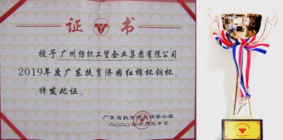 近日,经广东省扶贫开发领导小组认定,广州纺织工贸企业集团有限公司被授予“2019年度广东扶贫济困红棉杯”铜杯奖。
