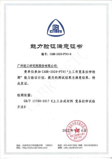 近日,广州轻工研究院股份有限公司收到由中国建筑科学研究院有限公司建筑工程检测中心举办的2020年度能力验证项目“土工布宽条拉伸检测”(CABR-2020-PT45-8)的结果反馈,获满意结果。