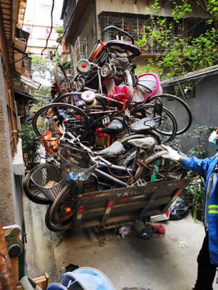 下午三时,纺织公司党员志愿者们跟随豪贤社区居委工作人员来到了位于豪贤南4号的居民楼。大家都被眼前的卫生死角震惊了。在狭长的单车棚下,杂乱堆放着不少发霉的木板,一长排落灰的旧单车错乱停放着,还有破损的旧沙发、旧家具等,堵得整个走道黯淡无光。据社区工作人员介绍,这里既惹蚊虫又不利于日常出行,是大楼居民一直想清理却没能摘除的“脏乱点”。