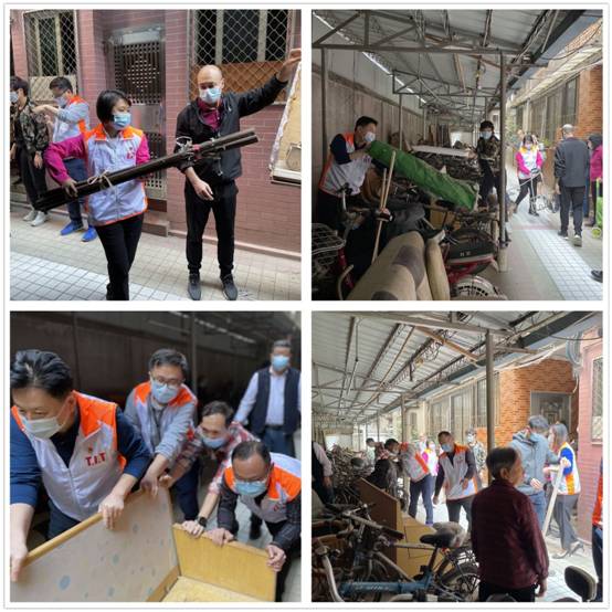 经过简单沟通后,纺织公司党员志愿者们和社区工作人员迅速投入到了整顿脏乱差的工作中。大家分工合作,有的搬木板、有的推单车、有的抬沙发、有的扫地面……