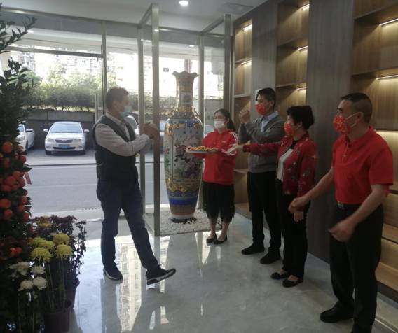 上午8点,利工民领导班子带着糖果巧克力在新大堂迎接上班复工的员工,为他们送上新年祝福。