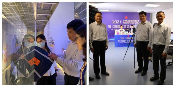 4月15日,第129届广交会正式“云端”开幕。纺织公司常务副总经理葛伟志、副总经理关勇带队前往属下参展企业察看现场参展工作。