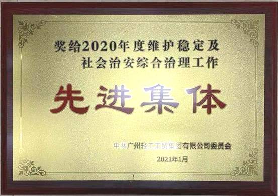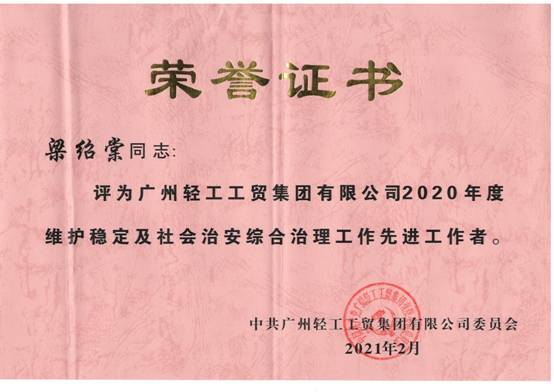 近日,广州轻工集团党委通报表彰了2020年度维护稳定及社会治安综合治理工作先进集体及先进工作者。纺织公司荣获“广州轻工集团2020年度维护稳定及社会治安综合治理工作先进集体”荣誉称号。属下托管中心梁绍棠荣获“广州轻工集团2020年度维护稳定及社会治安综合治理工作先进工作者”荣誉称号。