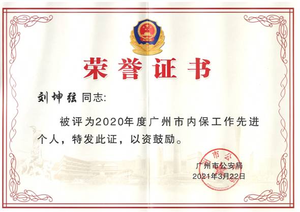 近日,广州市公安局授予纺织公司刘坤弦同志“2020年度广州市治安保卫重点单位内保工作先进个人”荣誉称号。