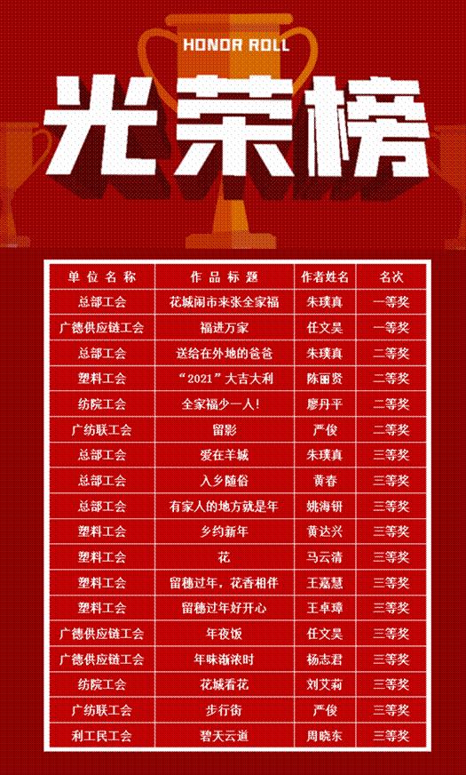 近日,广州轻工集团公布了2021年春节期间举办的“花城有爱 留穗过年”主题新春随手拍摄影比赛获奖名单。纺织公司收获满满,来自14名职工的18个作品榜上有名,其中一等奖2个、二等奖4个、三等奖12个。