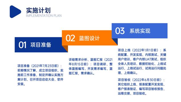 根据项目工作部署,本次信息化建设将分三阶段实施推进,包括项目准备、蓝图设计及系统实现。