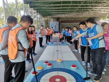下午,团队旱地冰壶竞赛压轴登场。首先由教练对“旱地冰壶”运动起源、玩法、积分规则等进行讲解。随后各队单独练习,八队车轮战正式拉开序幕。在每场对决中,队员们都全力以赴、集思广益,积极投入和默契配合一个都不少,比分上你追我赶,整个场面热闹非凡。