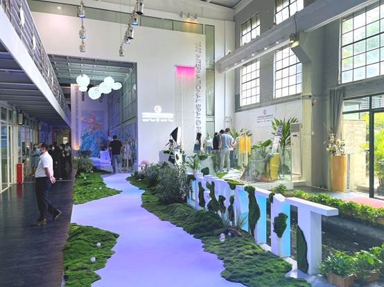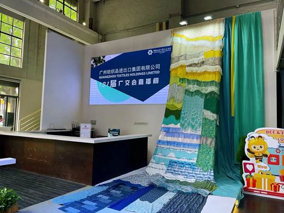 属下广州纺织品进出口集团有限公司的品牌设计中心在本届广交会以全新形象亮相。“绿野仙踪”的巧思妙想和精彩呈现使所有人眼前一亮,绿色、低碳、简约、安全的设计主题透露出企业发展的理念及担当。“生态文明绿”为总牵引,二次利用的绿植点缀着曲径的“林间小道”,棉花做的白云寓意“云广交、云贸易”,设计师用边角料制作的“高山流水”延绵不绝,并融合了棉花、纱线、面料、服装等纺织产业链的原生态展示。企业在此搭建了一个充满设计感和绿色生态氛围感的直播间,不仅实现与客商互动沟通,还彰显中国企业坚决落实低碳环保的决心和担当。