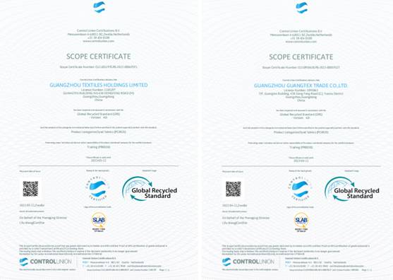 纺出公司、康德斯公司获得GRS证书