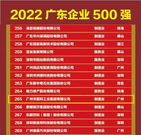 由广东省企业联合会和广东省企业家协会主办的“2022年广东企业500强”评选活动中,塑料公司荣膺2022年度“广东企业500强”称号,排位为第265名。
