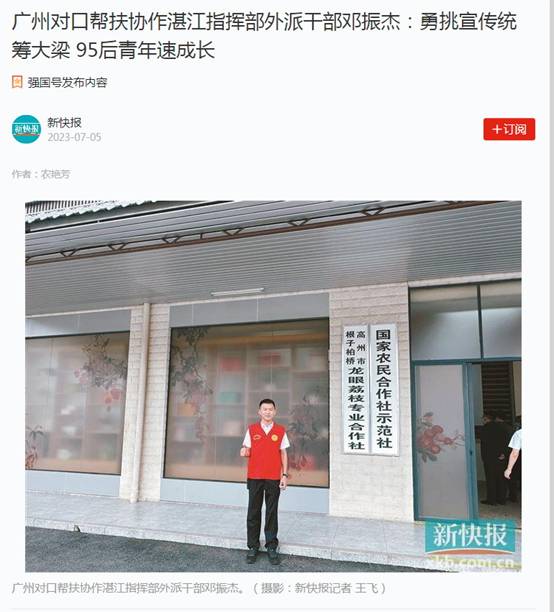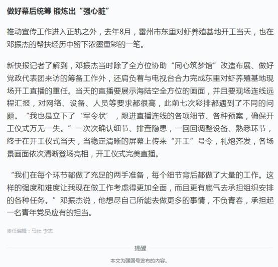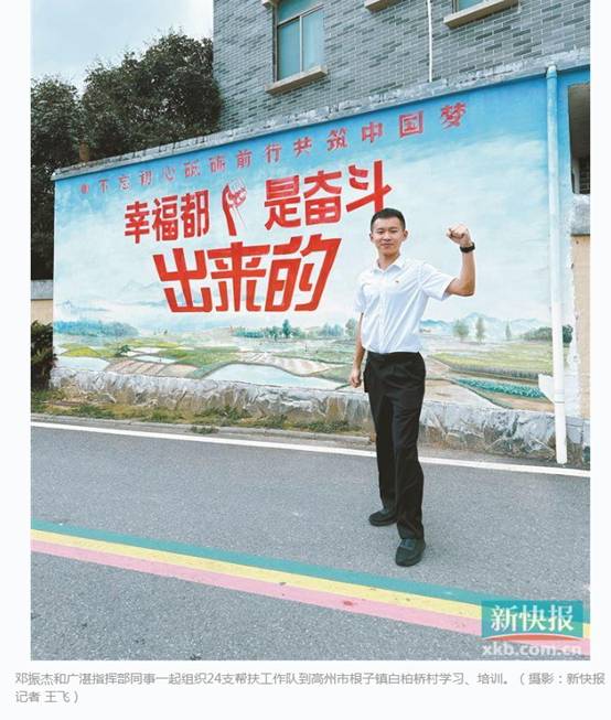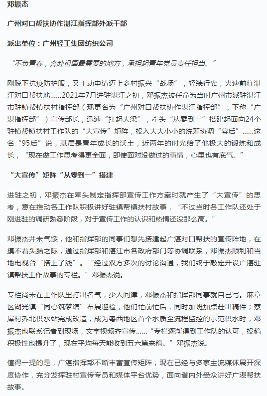 长期以来,纺织公司始终把脱贫攻坚、乡村振兴作为贯彻落实党和国家发展方略、践行国企重要社会责任来抓紧抓实,组建工作组,建立制度机制,投入人、财、物等资源,坚决打赢脱贫攻坚战,接续投入促进乡村振兴战略实施。纺织公司在收到省、市有关选派驻镇帮镇扶村干部的要求后,经过层层遴选,最终邓振杰同志脱颖而出,被分配到广州市派驻湛江市驻镇帮镇扶村指挥部,负责宣传工作。用他自己的话说,切实感受到纺织公司丘海澜副书记所描述的,背后有强大的阵容,不是一个人在前方孤军奋战,让他能够没有后顾之忧,迅速进入状态,在艰苦环境中锤炼党性、磨练意志、增长才干,不辱使命为公司争得荣誉。他表示会牢牢记住纺织公司党委书记、董事长简玮仪对他的殷切嘱咐,“把握这次基层锻炼的机会,正如你的名字振杰那样,为乡村振兴作出杰出贡献!”