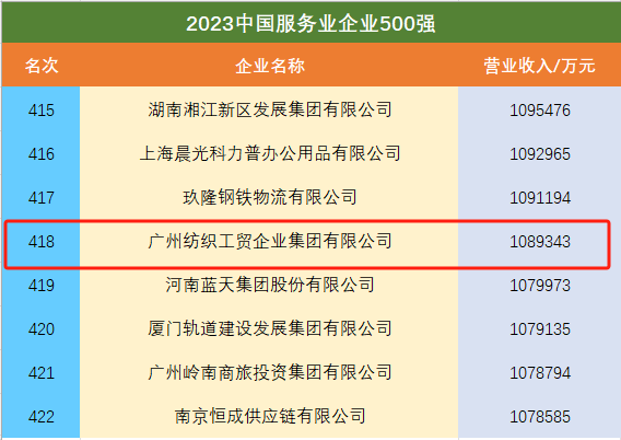 9月20日,中国企业联合会、中国企业家协会发布“2023中国服务业企业500强”榜单。广州纺织工贸企业集团有限公司第九次上榜,位列第418位,彰显了稳健发展的综合实力。