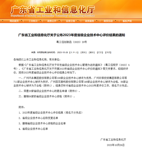 省级企业技术中心评价由广东省工业和信息化厅根据相关规定对企业技术中心的研发体系、研发设备、研发投入及研发人员进行综合评价,是省政府有关部门为进一步提高企业自主创新能力,根据《国家认定企业技术中心管理办法》和有关法律法规设定的企业荣誉资质。