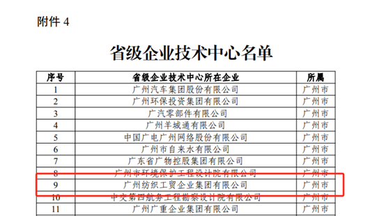 近日,广东省工业和信息化厅公布2023年度省级企业技术中心评价结果,广州纺织工贸企业集团有限公司顺利通过本次评价,连续多年获评省级企业技术中心称号。