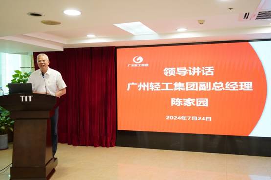 最后,广州轻工集团副总经理陈家园发表讲话。他对纺织公司2024年上半年的工作表示肯定与鼓励。在接下来的工作中,他对纺织公司提出了五点要求:一是提升主业竞争力,探索高质量发展新路径;二是优化资源配置,提升团队战斗力;三是发挥“链主”作用,服务发展大局;四是坚守依法合规,守牢安全底线;五是强化党建引领,确保廉洁从业。