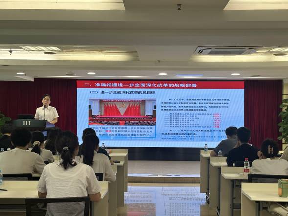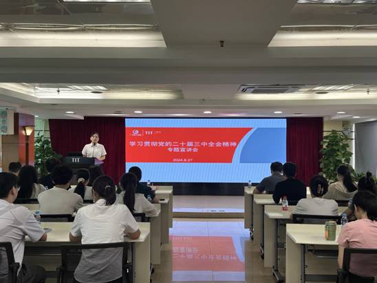 8月27日,纺织公司团委书记梁晨在广德大厦15楼会议室为各团组织书记、委员,本部及纺出公司团员青年,2024年新入职管培生共47人作学习贯彻党的二十届三中全会精神专题宣讲。在宣讲过程中,梁晨通过鲜活的语言、生动的案例,从深刻把握进一步全面深化改革的重要性和必要性,深刻认识进一步全面深化改革的指导思想和总目标、重大原则、重要部署,认真落实进一步全面深化改革的实践要求等方面深入浅出地对全会精神进行了系统阐述和解读。