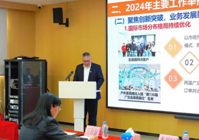 公司党支部书记、董事长周逊姜以《务实谋新提质效,深化改革促发展》为题作工作报告。报告从聚焦主业、赋能蓄力、培根铸魂三个方面总结了公司2024年的工作情况。2024年,广纺联公司统筹抓好地块交储、物业管理等多项工作,公司实现营业收入完成预算目标值103%;利润总额完成预算目标值156%。报告指出,2025年广纺联公司将围绕广州轻工集团及纺织公司的总体部署,紧扣“数智领航链全球,提质增效建新功”的工作主题,从紧盯主责主业、提升改革深化、坚持党建引领、加强风险防范、强化人才队伍建设等五大方面推动经营工作实现质的有效提升。