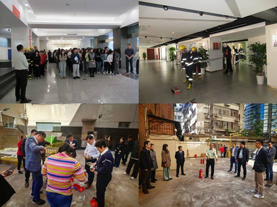 消防演习期间志愿消防队穿戴灭火装具迅速赶往火场进行灭火,大楼办公人员进行紧急疏散,培训人员进行了防烟面罩使用、灭火器使用等现场演练。