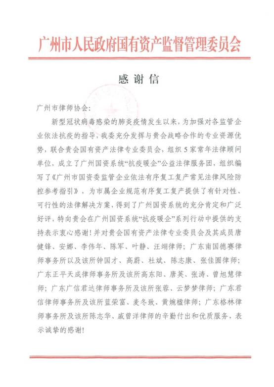 服务:充分发挥专业优势,助力复工复产。纺织公司汪翊律师作为广州市律师协会国有资产法律专业委员会的成员之一,积极投身广州国资系统“抗疫暖企”公益法律服务团,参与编写了《广州市国资委监管企业依法有序复工复产常见法律风险防控参考指引》, 并得到广州市国资委的诚挚感谢。