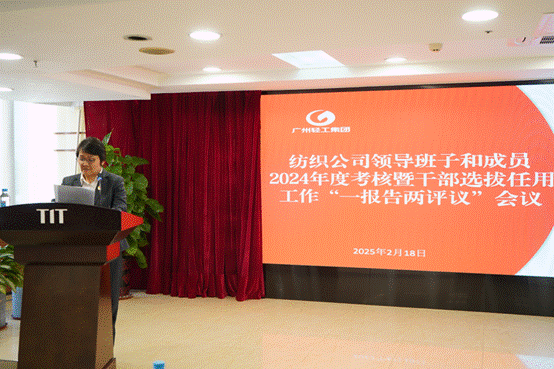 2月18日下午,纺织公司党委召开领导班子和成员2024年度述职暨干部选拔任用工作“一报告两评议”会议。会议由公司党委副书记、工会主席丘海澜主持。纺织公司领导班子成员、中层管理干部、公司“一代表两委员”以及党员干部群众代表参加了会议,广州轻工集团纪检监察室派员出席了会议。