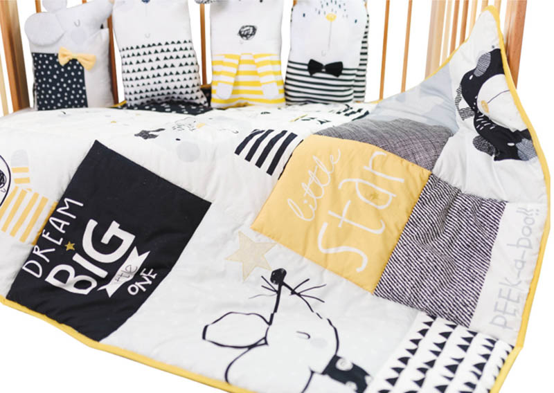The regular bedding sets consist of a quilt,a fitted sheet, a bedspread, and bumper. It can also be designated by customers. High-quality fabrics, exquisite embroidery, active printing and dyeing,soft feeling, safety and environmental protection, and with good air permeability. The product adopts pre-shrink technology, and the size is just used after washing. Strengthen the edge process, it will more three-dimensional and more durable. Thicken bumper, high bounce back, no matter the baby left and right, still treated gently. According to customers' needs, we can make different sizes and patterns.