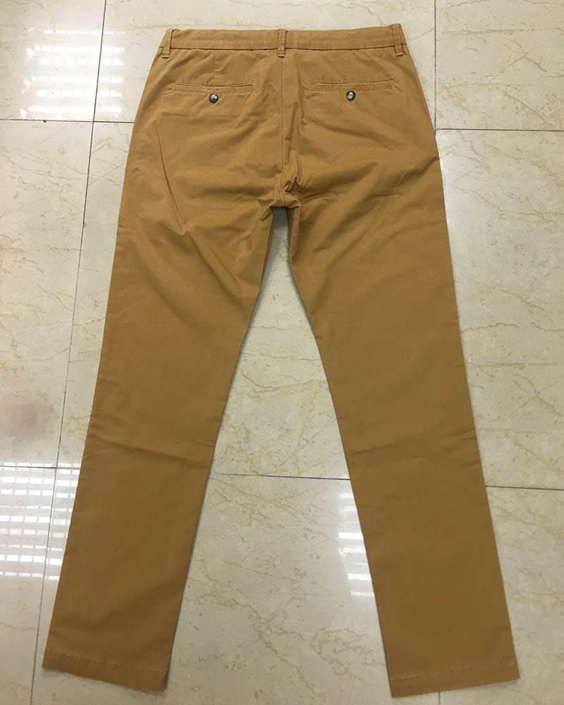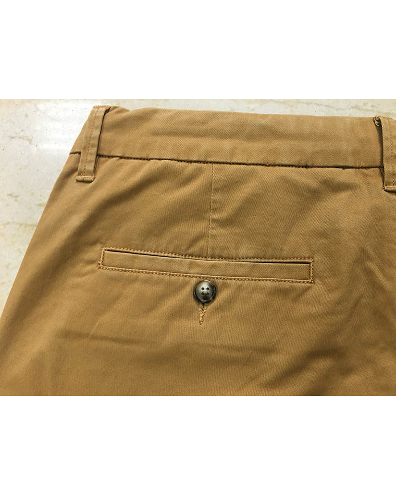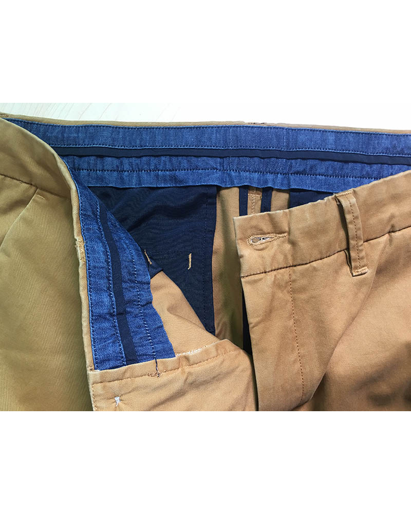 Fabric of this chino pants is cotton with spandex. The contrast denim fabric and piping on the waist give the pants a flash look.