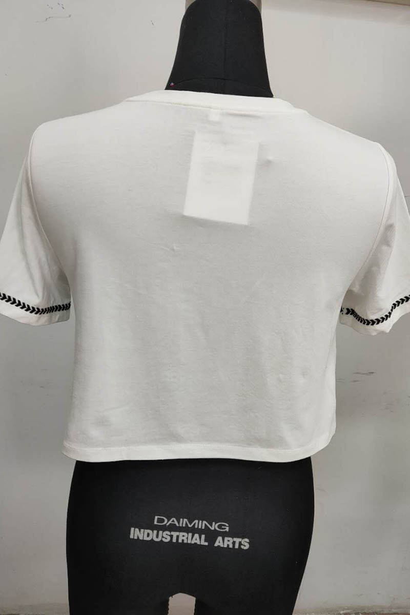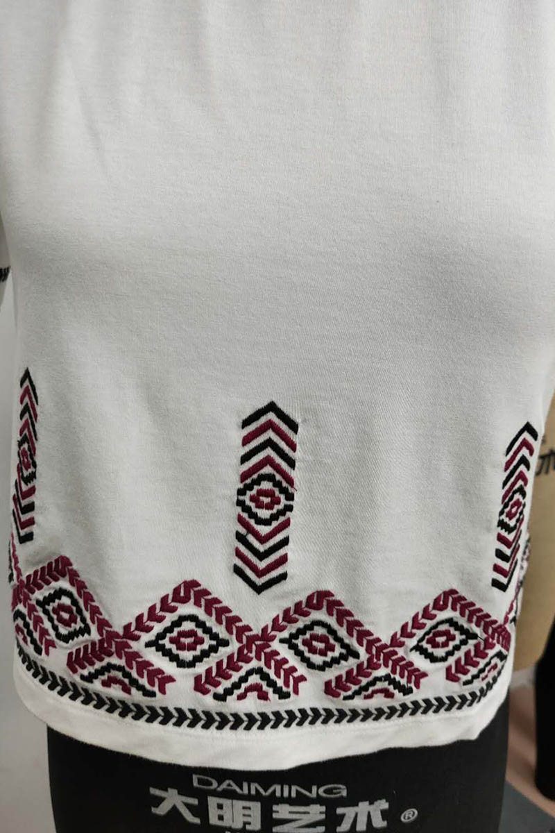 A top with embroidery details at hem and cuff.Short sleeve and round neck. Made in cotton /modal.